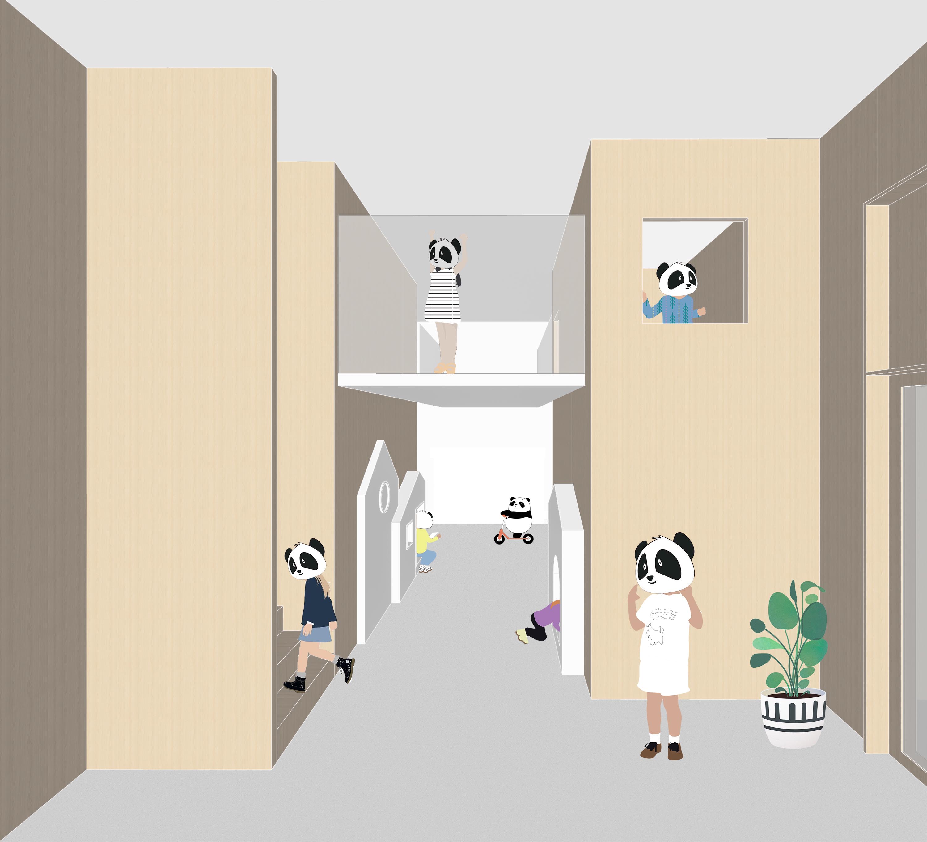 内部空间打破传统的围合空间形式,增加内外的联系,增强孩子与老师间的互动体验。利用特定的层高让老师与孩子们产生更直接的趣味性对话。
