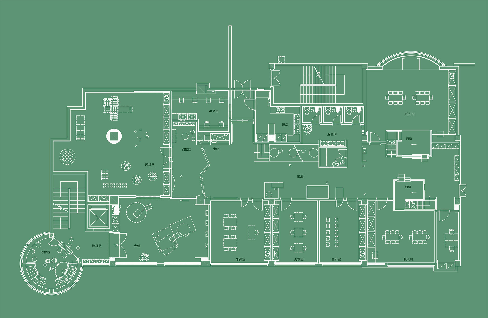 在空间中使用了大量绿色,营造出一种区别于传统儿童空间的色调。绿色与橡木结合,突出绿色森林的设计理念,打造出一种柔和宜人、温暖而轻松的环境。